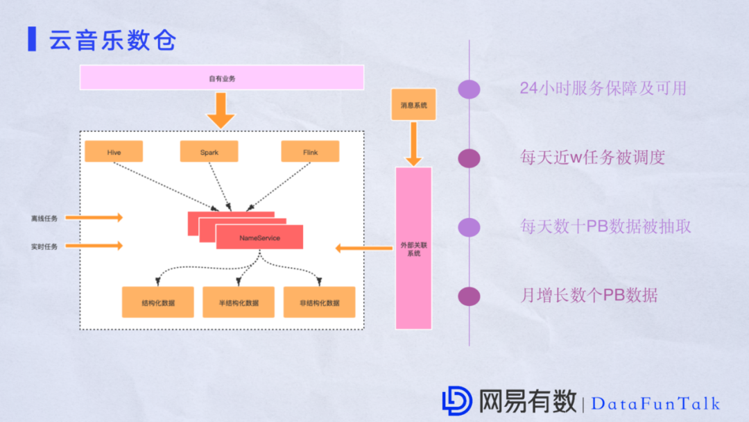 这是某个部门数仓的业务,其实很复杂。集群支持多种数据格式,半结构化数据和非结构化数据会陆续流入到集群中。而且有大量的离线任务和实时任务。在这个过程每天会有数十PB的数据出去,增长速率非常快,最重要的是这个过程需要保障24小时可用。其实这个挑战相当大,经过一段时间和业务的沟通之后做了很多优化,目前运行非常良好。