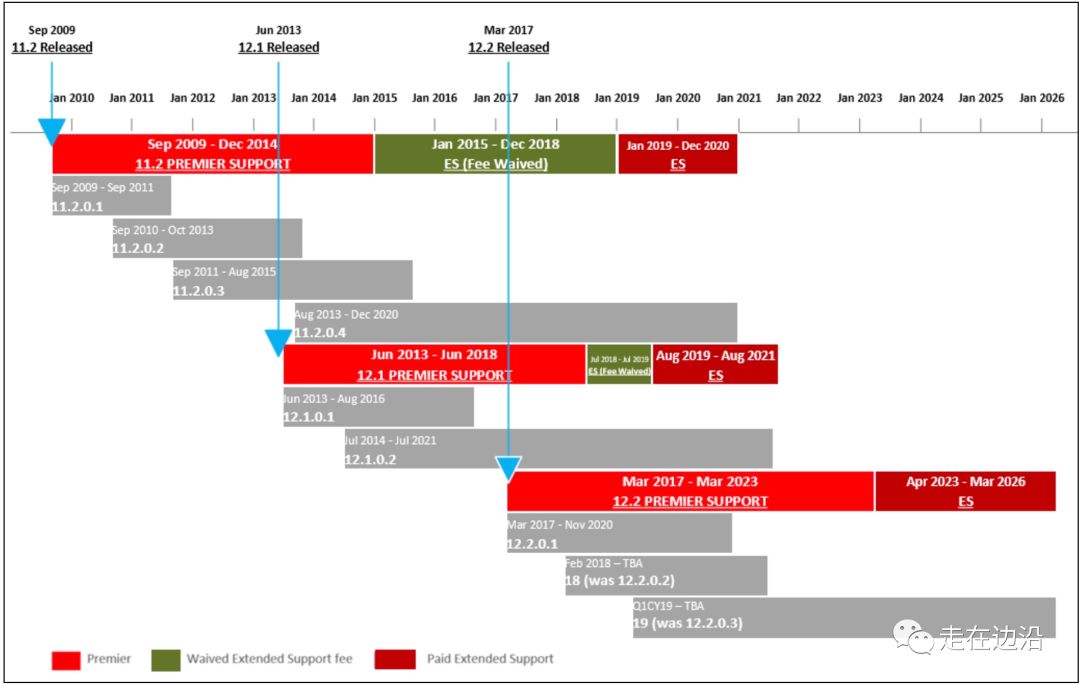 放一张Oracle官方关于11gR2及12c版本的支持周期图。