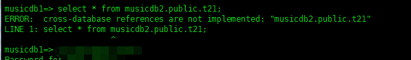 select * from musicdb1.public.t11;在这个连接中(使用数据库用户user1连接到数据库musicdb1),如果试图访问数据库musicdb2下的t21表会报错:
