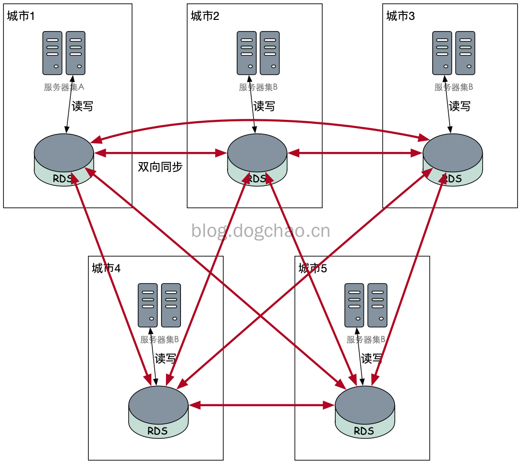 实际上我猜测很多业务也是按照上图去实现的,比如滴滴打车业务这种,所有的业务都是按城市划分开的。用户、车主、目的地,他们的经纬度通常都是在同一个城市的。单个数据中心并不需要和其他数据中心进行数据交互,只有在统计出报表的时候才需要,但报表是不太注重实时性的。那么,在这种情况下,全国的业务其实可以被很好的sharding的。