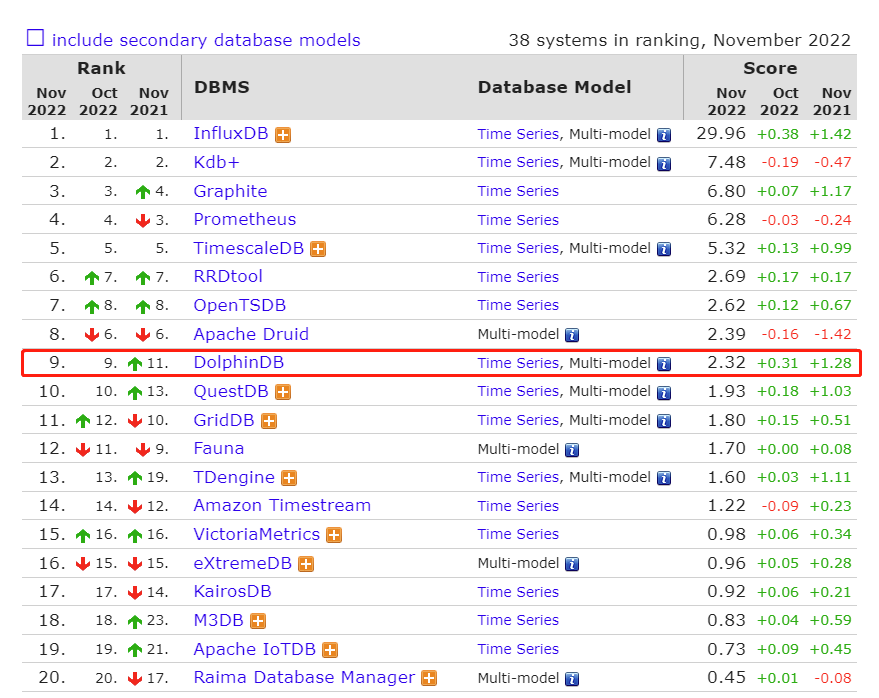 从开发效率和计算性能上考虑,DolphinDB 设计了多个独立实时计算引擎,可以让业务人员以低代码的方式实现各种场景的复杂计算。DolphinDB 还提供了上百个实现了增量算法优化的内置算子,并支持内存交换方式输出计算结果,将整体计算链路的时延压缩到极致。此外,DolphinDB 作为时序数据库本身具有优秀的批计算能力,并且能够达到“流批一体”,即批计算和流计算可以使用同一套代码,并保证批计算与流计算的结果完全一致,在金融等领域此特性可以帮助企业实现产研一体,极大缩减从投研到投产的周期。作为国内领先的时序数据库厂商,DolphinDB 集高性能时序数据库(time-series database)与全面的分析功能为一体,可用于海量结构化数据的存储、查询、分析、实时计算,实现 PB 级数据查询毫秒级响应以及复杂分析任务秒级响应,助力企业实时商业决策。在国际权威的数据库排行网站 DB-Engines 今年11月的最新排名中,DolphinDB 持续保持时序数据库榜单国内排名第1,全球第9,也是唯一进入前10名的国产厂商。