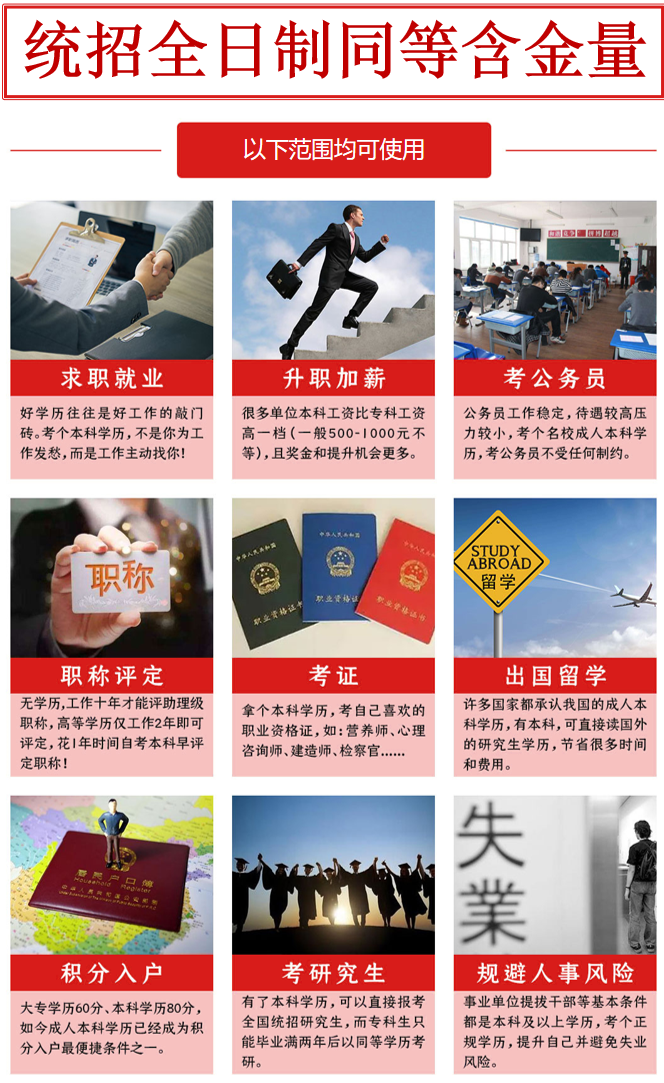 ☑含金量高:证书教育部备案,学信网终生可查,毕业后享受普通高校全日制毕业生同等待遇:拿证后可出国留学、积分落户、考研考公、职业资格证考试、升职加薪等。