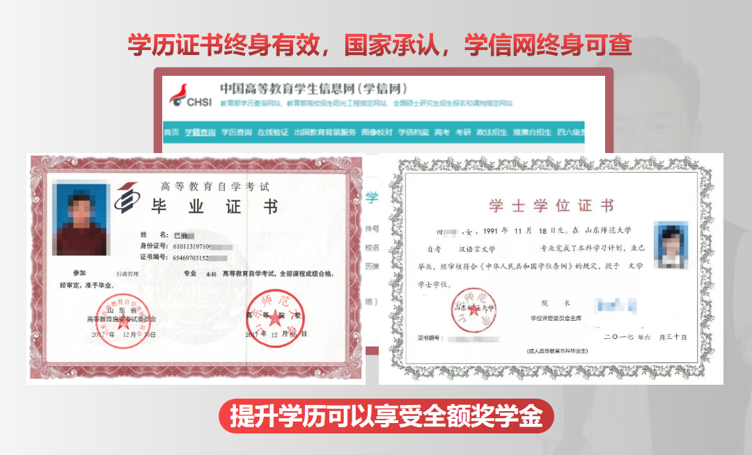 成人学历提升可选高升专、专升本、第二学位三种方向,免试入学,1年半后颁发毕业证书、学位证书,国家承认,学信网可查,享受普通院校全日制本科学历同等待遇。