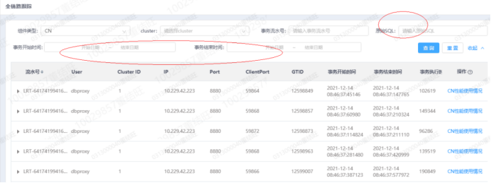 (IP,PORT),事务流水号,事务开始及结束时间,事务内各SQL语句信息,以及每个SQL语句对应的下到每个分片上的子SQL语句信息等。为运维人员、DBA提供可视化、端到端的故障问题快速定位新助手。全链路跟踪主要界面请参见图3。