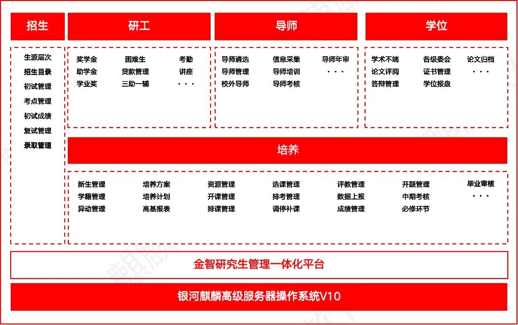 研究生教育是培养高层次创新人才的主要途径,是应对全球人才竞争的基础布局,是实施创新驱动发展战略和建设创新型国家的重要基石。如何将现代网络信息技术融入研究生教育管理中,以提升研究生教育管理水平,成为研究生教育管理改革必须思考的关键问题。麒麟软件与江苏金智携手合作,共同打造了新一代研究生综合管理与服务平台解决方案,实现顶层规划教学资源分配、支撑本研贯通、全链条的质量监控体系,提升高校治理水平,打造一站式管理服务,共建智慧校园生态。