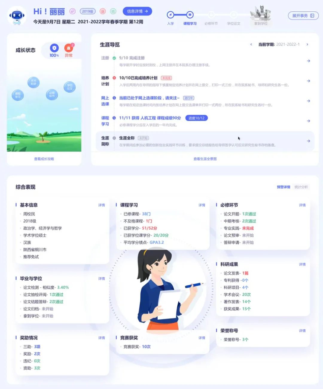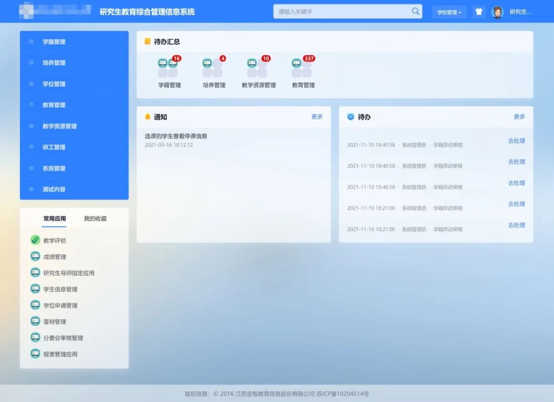 • 实现了全域业务线上化,建设与研究生学籍管理业务相关的10余个功能应用,实现了研究生信息动态管理;