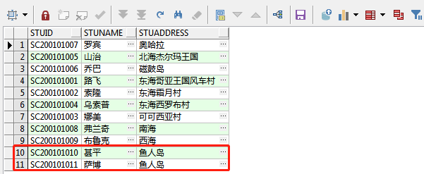 从上面截图中可以看到,STUID为10和11这两条记录的STUADDRESS的值相同,STUNAME的值是以降序来排列的。