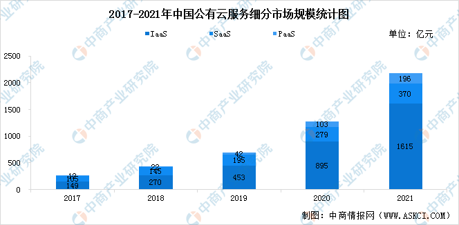 从细分市场来看,我国公有云IaaS及PaaS保持高速增长,SaaS稳步发展。2021年,公有云IaaS市场规模达1615亿元,增速80.4%,占总体规模的比例接近四分之三;PaaS依然保持着各细分市场中最高的增长速度,同比增长90.7%至196亿元;SaaS市场继续稳步发展,规模达到370亿元,增速略微滑落至32.9%,预计在企业上云等相关政策推动下,有望在未来数年内随着数字化转型重启增长态势。