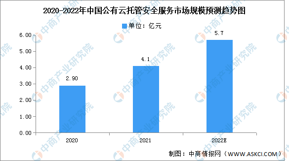 数字化转型浪潮下,众多新兴技术快速发展,云计算作为其中重要的新型基础设施在政策和市场需求的共同推动下迎来了巨大的发展机遇。与此同时,云上的安全问题也受到了最终用户的关注。在此背景下,公有云托管安全服务秉承维护用户云上安全为宗旨,以其方便、快捷、高效、专业的优势开始被众多用户选择,市场迎来快速发展期。2021年,中国公有云托管安全服务的市场规模约为4.1亿元,同比增长41.6%。预计2022年将增长至5.7亿元。