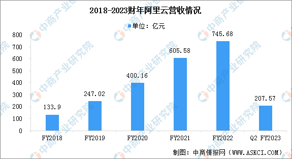 从营收来看,2018-2022财年,阿里云营收规模从133.9亿元增长到745.68亿元,增长了约5倍。2023财年第二财季财报,阿里云营收207.57亿元,同比增长17.37%。