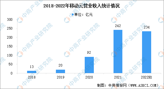 2021年中国移动全年总营收8483亿元,同比增长10.4%。其中,移动云收入达到242亿元,同比增长114%。2022年上半年移动云收入234亿元,同比增长103.6%。
