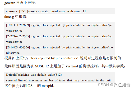 这个问题原因在于 R7 或是 S12 系列,使用了 systemd,在 R6 或 S11 上没 有,当这个启动后,忽略掉/etc/security/limits.conf 下的设置。 DefaultTasksMax 参数(默认 512)需要放在/etc/systemd/system.conf 中,我们可以安装集群过程中修改该值,但是如果不重启操作系统的话, 不会生效,这个属于新版操作系统问题,需要在安装集群前设置生效。综 上,需要部署集群前,手动设置