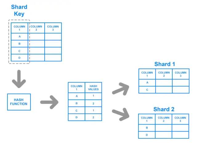 为了保证所有数据的保存位置正确,保存行为一致(即相同的数据每次都保存到相同的位置),哈希函数的输入值应当为同一列数据。这列数据被称为分片键。简单一点,分片键就类似于主键,两者都是用来给每个数据/分片创建一个唯一标识的。一般来说,分片键应该是静态的,也就是说它不应该保存可变的数据。否则,更新数据的时候将会产生更多的工作量,还可能会降低性能。