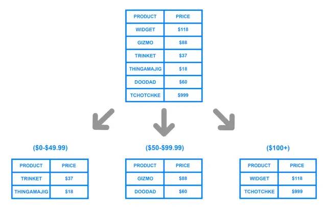 基于范围的数据库分片基于给定数据的范围来对数据做分片处理。这么说吧,假如你有一个保存着零售店的商品信息的数据库,你可以创建一些数据库分片,然后根据价格区间将商品数据分布到不同的分片中,像这样:
