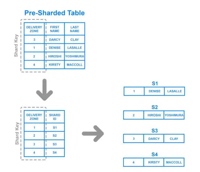 这个例子中,Delivery Zone 列被定义为分片的键,分片键的值和该行数据保存的分区被一起写入查找表中。这跟基于范围的数据库分片类似,但是我们并没有判断数据落在了哪个区间,而是将每条数据绑定到了其所在的分片。相对于基于范围的数据库分片来说,基于目录的数据库分片不失为一个更好的选择,假如分片键的基数本来就很小,那么对于数据库分片来说,保存某个范围的键将变得没有意义。当然,基于目录的数据库分片也不同于基于键的数据库分片,它并不使用哈希函数来处理分片键,而只是在查找表中检查键名然后找到数据需要被写入的位置。