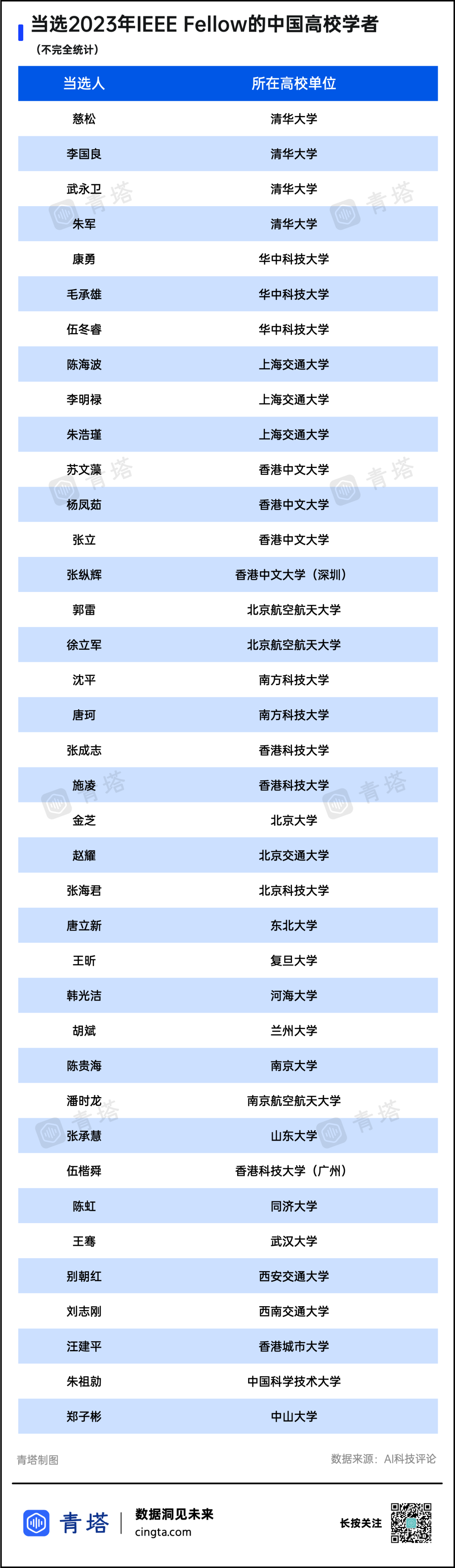 刚刚,国际电气和电子工程师协会(IEEE)公布了 2023 年新晋 Fellow 名单。IEEE的全称是美国电子电气工程师学会(Institute of Electrical and Electronics Engineers),是国际性的电子技术与信息科学工程师的学会,IEEE Fellow(IEEE会士)为学会最高等级会员,是IEEE授予成员的最高荣誉。在新增名单中共有 319 位学者入选,其中华人学者有104位(占总人数的31.3%左右)。在华人学者中,清华大学4人,华中科技大学、上海交通大学和香港中文大学分别有3人;北京航空航天大学、南方科技大学和香港科技大学2人;其余单位各1人入选。部分入围2022IEEE Fellow 中国高校科学家简历别朝红 西安交通大学别朝红,西安交通大学教授/博导,国家级人才称号获得者,现任西安交通大学党委常委兼电气学院院长、陕西省智能电网重点实验室主任。张纵辉 香港中文大学(深圳)张纵辉,台湾清华大学博士,国家高层次青年人才,现为香港中文大学(深圳)副教授、助理院长(主管教育)、广东省大数据计算基础理论与方法重点实验室副主任、深圳市大数据研究院研究员。目前与过去分别担任国际信号处理顶级期刊《IEEE Transactions on Signal Processing》资深编委,网络信号处理顶级期刊《IEEE Transactions on Signal and Information Processing over Networks》、《IEEE Open Journal of Signal Processing》编委,IEEE信号处理协会(SPS)通信网络信号处理技术委员会委员、感知通信一体化工作组发起人与首届主席和IEEE SPS 董事会亚太区独立主席。陈海波 上海交通大学陈海波,男,博士,上海交通大学软件学院教授、华为操作系统首席科学家、操作系统内核实验室主任、SOSP首位中国学者主席。系统软件,系统结构与系统虚拟化。陈虹 同济大学陈虹,同济大学特聘教授,中国自动化学会会士,国家杰出青年科学基金获得者,曾任吉林大学汽车仿真与控制国家重点实验室主任。分别于1983年和1986年在浙江大学过程控制及自动化仪表专业获工学学士和工学硕士学位,1997年以最高荣誉(mit Auszeichung bestanden)在德国斯图加特大学获工学博士学位,2000年从吉林大学机械工程博士后流动站出站(合作导师郭孔辉院士)。陈贵海 南京大学陈贵海,南京大学教授、博导,主要研究方向为分布式网络与数据处理,包括未来网络系统与协议、无线网络结构与优化、物联网与传感网、新型计算机体系结构、数据中心核心技术、数据分析与处理等。1984年获南京大学学士学位,1987年获东南大学硕士学位,1997年获香港大学博士学位,1998年任日本九州工业大学访问教授,1999年任香港大学研究员,2000年任澳洲昆士兰大学访问教授,2001~2003年受任美国韦恩州立大学访问教授。慈松 清华大学现任清华大学电机系研究员,国家级人才,信息能源教育部-中国移动联合实验室(筹)主任,能源互联网领域知名专家,国家能源局中国能源互联网发展战略研究课题组首席科学家,国家能源局能源互联网行动计划预研课题组负责人,德国慕尼黑工业大学(TUM)Global Visiting Professor,曾任美国内布拉斯加大学终身教授。郭雷 北京航空航天大学郭雷,1966年生于山东。北京航空航天大学教授,博导,国家杰出青年基金获得者,教育部新世纪优秀人才。分别于1988年、1991年获得学士和硕士学位,1997年获得东南大学博士学位(冯纯伯院士)。韩光洁 河海大学韩光洁,河海大学教授/博导,全国工业机械电气系统标准化技术委员会SAC/TC231/SC3委员、IET Fellow、EAI Fellow、CCF杰出会员、IEEE高级会员,中国计算机学会物联网专委会常务委员和计算机应用专委会委员。长期从事智慧海洋、工业物联网、人工智能等方面研究。胡斌 兰州大学胡斌,教授,现任兰州大学信息科学与工程学院教授;IET Fellow;中国计算机学会协同计算分会主任;教育部计算机学科教指委委员;国家自然科学基金委信息科学部计算机科学专家评审组成员;ACM中国分会执行委员;国际社会神经科学中国分会理事,Web Intelligence Consortium(WIC)中国分会理事;瑞士苏黎世联邦理工学院客座教授等。2021年8月1日,入选2021年中国科学院院士增选初步候选人名单(信息技术科学部)。金芝 北京大学金芝,1962年6月生,现任中国科学院数学与系统科学研究院研究员,北京大学教授,博士生导师,国家杰出青年基金获得者。担任北京大学高可信软件技术教育部重点实验室副主任,中国科学院管理、决策与信息系统重点实验室副主任,湘潭大学智能计算与信息处理教育部重点实验室学术委员会委员。康勇 华中科技大学康勇,博士,华中科技大学教授、博士生导师。电力电子与能量管理教育部重点实验室主任。武汉新能源研究院院长。一直从事电力电子与电力传动领域的教学和科学研究。主持和参加了11项国家自然科学基金(其中1项重点基金)、863计划、十二五预研、国家重点研发计划等项目,先后承担包括国家、省部级重要科研在内的100多项科研项目。李明禄 上海交通大学李明禄,上海交通大学计算机科学与工程系长聘教授 、新世纪人才计划 、网格计算中心主任,主讲课程有网格计算、服务计算;研究方向是云计算、车辆自组网络、无线传感器网络、大数据分析。李国良 清华大学李国良,清华大学计算机系长聘教授,杰青。主要研究方向为数据库,众包数据管理,大数据清理和集成,空间文本数据处理。在数据库、数据挖掘、信息检索领域的顶级会议和期刊上发表论文150余篇,他引10000余次,入选爱思唯尔2014-