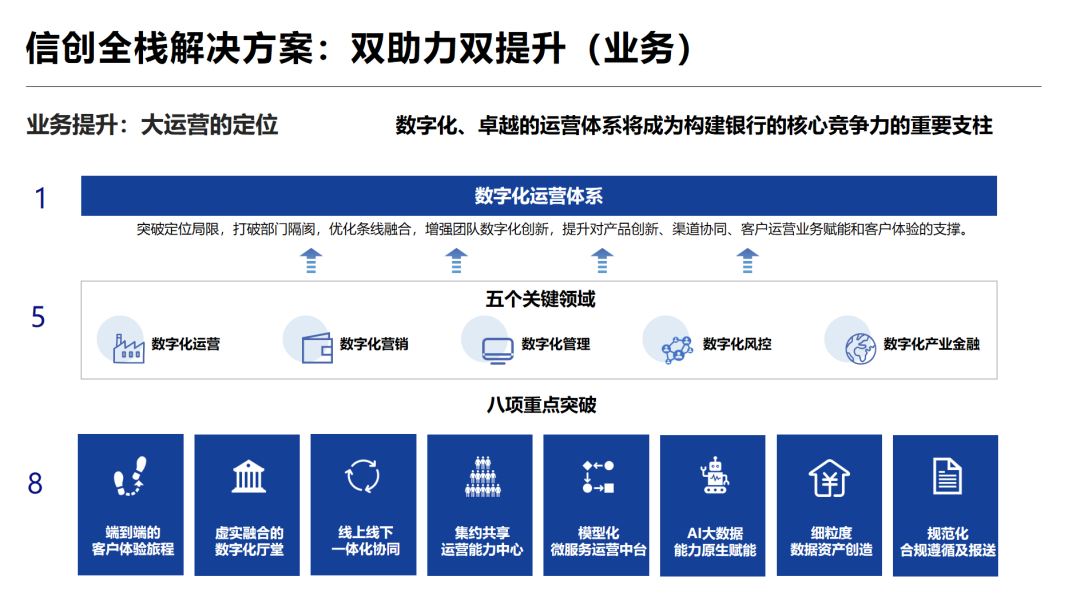 嵇津湘先生指出,信创不仅是技术替换,同时还是实现技术提升与业务创新的机遇;IT最终并不是只为了交付系统,而是为了解决金融问题。信雅达希望能够以更具高度的信创全栈全产品解决方案(点击查看方案详情),为金融机构实现“信创+数字化”同步落实提供双助力,最终实现“IT自主可控能力+业务创新能力”的双提升。在该解决方案中,信雅达在五大数字化板块(数字化运营、数字化营销、数字化管理、数字化风控、数字化产业金融),与本次活动的承办方之一星环科技在多个数据库领域进行了深度的合作。最后,嵇津湘先生表示,2021年以来,信雅达以1套顶层设计、5个战略方向、8项重点突破,帮助银行规划和建立起面向数字化时代的银行大运营体系(详见下图)。信创时代,信雅达已经准备就绪,期待与更多金融客户和同业一同开启信创和数字化转型的合作。星环科技金融行业助理副总裁张晓明发表了《科技自强与金融信创:政策与实践》主题演讲。