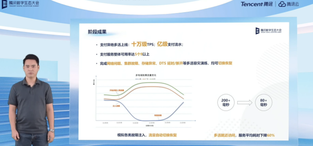 腾讯电子卡副总经理黄志斌进一步分享了腾讯云DTS在腾讯微卡支付多活数据中心的落地实践。作为跨平台、跨介质、深度支付整合的电子卡解决方案,腾讯微卡目前已服务于数十万校企客户,覆盖千万级C端用户。基于DTS强大的数据同步能力与灵活的冲突解决方案,腾讯微卡构建了异地多活的高可用架构,在数据层实现了多地读写、多向同步。该架构目前已实现十万级TPS、月度亿级支付流水的支持,多活就近访问情况下服务平均耗时下降60%,支付服务整体可用率达5个9以上。