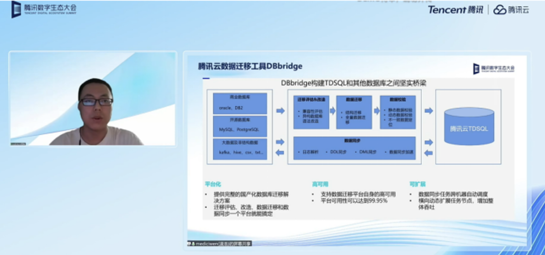 在备受关注的数据库国产化领域,腾讯云数据库高级工程师温浩讲解了腾讯自研数据库TDSQL助力某保险企业实现异构数据库迁移的最佳实践。基于腾讯云TDSQL和数据迁移工具DBbridge,温浩团队顺利帮助客户完成了从Oracle到国产化数据库的平滑迁移,满足了其对核心数据库高可用、多中心容灾、多场景支持的要求,实现了关键数据库领域的自主可控。