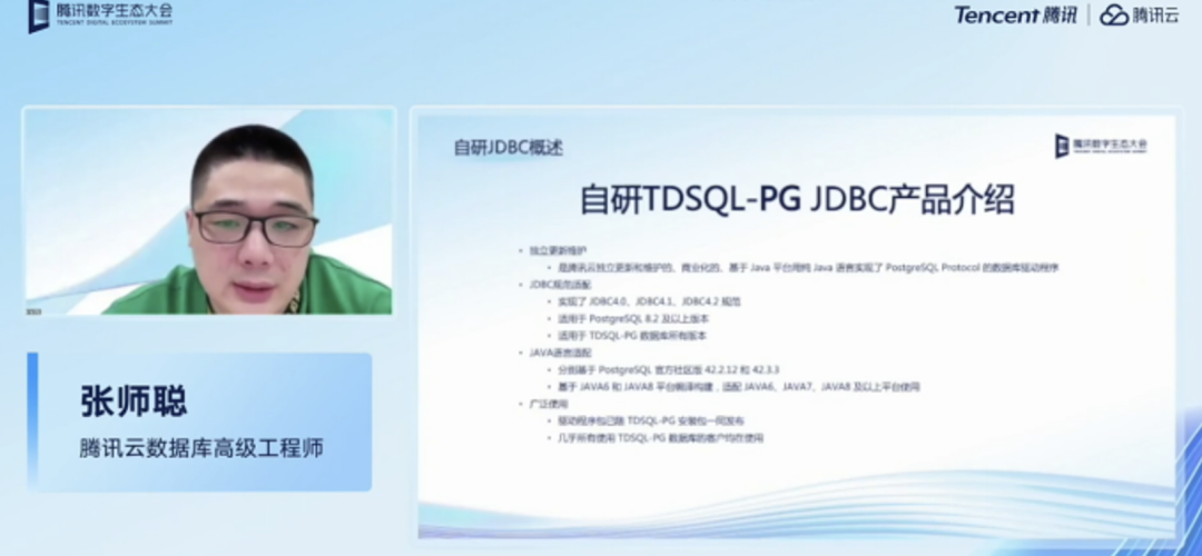 专场最后,腾讯云数据库高级工程师张师聪介绍了TDSQL在数据库驱动层面的应用适配解决方案。目前,腾讯云已自研有TDSQL- PG JDBC、TDSQL- MySQL JDBC、TDSQL- ODBC、TDSQL- OCI等多款数据库接口产品,其拥有负载均衡、直连/读写分离、多项漏洞修复、开发框架高兼容性等特性。目前,TDSQL-PG JDBC已实现了独立维护更新及商业化,受到几乎所有TDSQL数据库客户的采用,TDSQL- MySQL JDBC亦被多家大型银行采用。