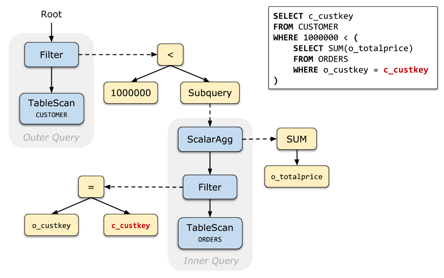 关联子查询的本意为外表每一行数据与子查询集合数据的运算。当外表数据行过多时,这一嵌套的过程将不可避免导致性能低下。因此子查询优化很重要的一步就是去关联化(unnesting),如今的去关联技术已经日趋成熟,HyPer 2015 年就宣称自己能够《Unnesting Arbitrary Queries》。