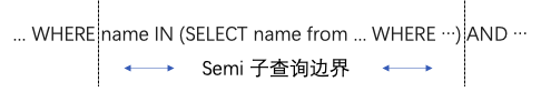 SEMI/ANTI:查询块可以输出多行, 只有配合子查询的 ANY,ALL 表达式才能将输出限制为一行 boolean 值。因此边界必须包含子查询表达式前面的入参。