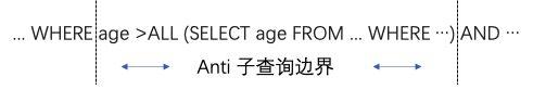 Anti-Semi:(NOT EXISTS, NOT IN, ALL) 可拆解为合取的逻辑关系,例如 AGE >ALL (SELECT AGE) 子查询可表达为 a.age>b.age[0] AND a.age>b.age[1] AND ... AND a.age>b.age[n]