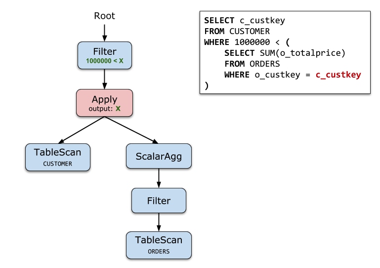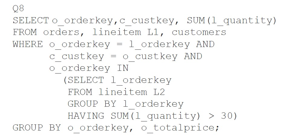 SELECT c_custkeyFROM CUSTOMERWHERE 1000000 < (SELECT SUM(o_totalprice)FROM ORDERSWHERE o_custkey = c_custkey)