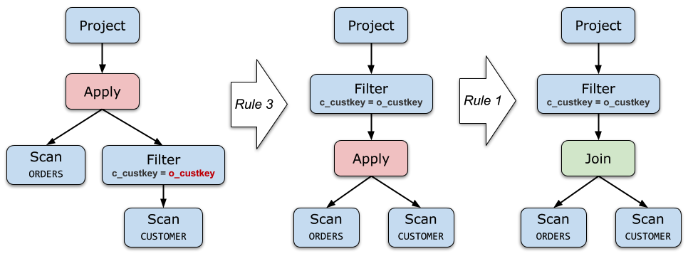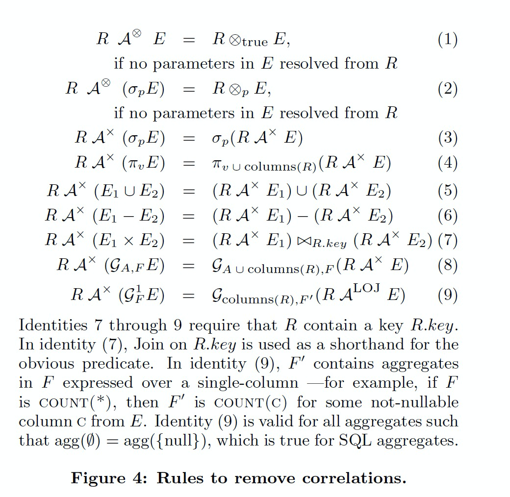 在 01 年发布的《Orthogonal Optimization of Subqueries and Aggregation》论文是基于规则去关联化的集大成作,其中总结了 9 条转换规则:
