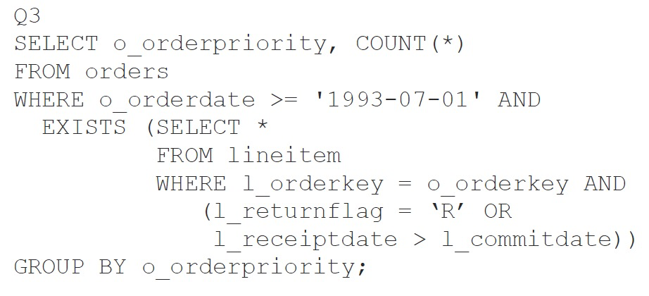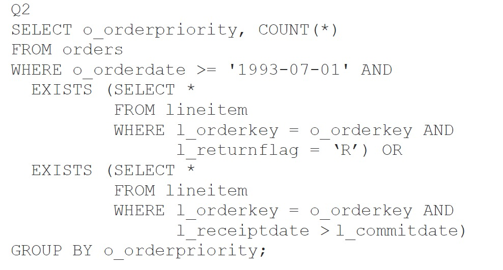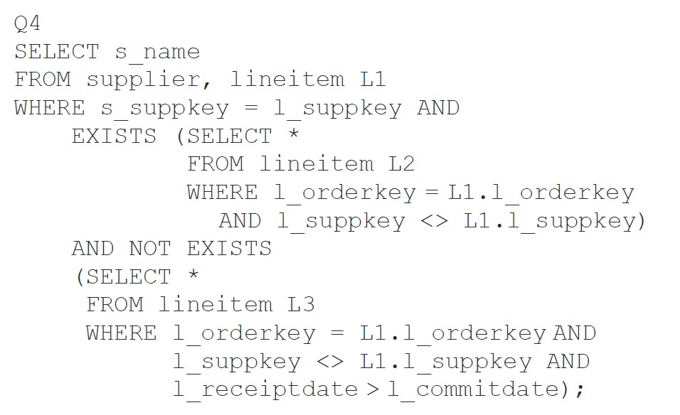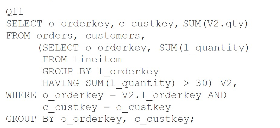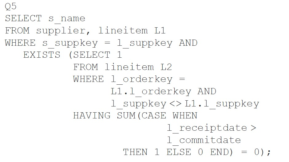 Q4:SELECT sum(l_extendedprice) 7.0 AS avg_yearlyFROMlineitem,partWHEREp_partkey = l_partkeyAND p_brand = 'Brand#23'AND p_container = 'MED BOX'AND l_quantity < (SELECT 0.2 * avg(`l_quantity`)FROMlineitemWHEREl_partkey = p_partkey);