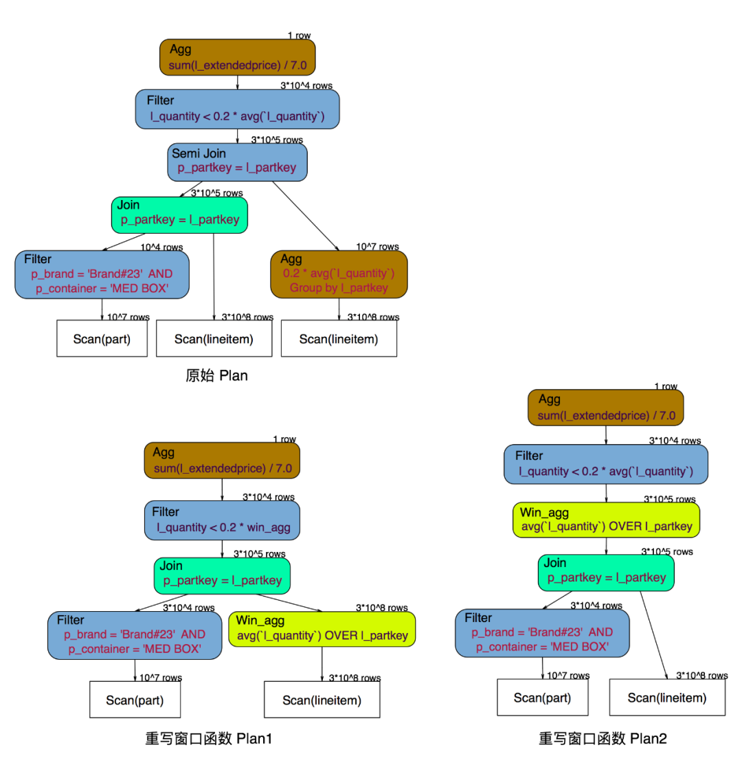 在将 Q1 重写为 Q2 之后,会在 CBO 中根据 Cost 判断是否需要转化为 Q3 的形式。这里举个具体的例子 Q4(TPC-H Q17):