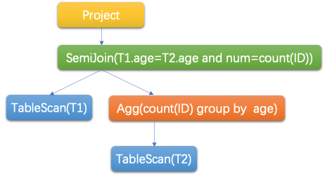 如果将其转为以下的执行树,当 T2 的某 age 数量为 0 时,SemiJoin 的连接会因为 T1.age=T2.age 表达式结果为 Null,从而无法输出正确的结果。本质上的原因是由于 COUNT 聚合函数的特殊性导致。想要解决必须要 Join 节点输出 Null 行,类似 Left 类型的特性。