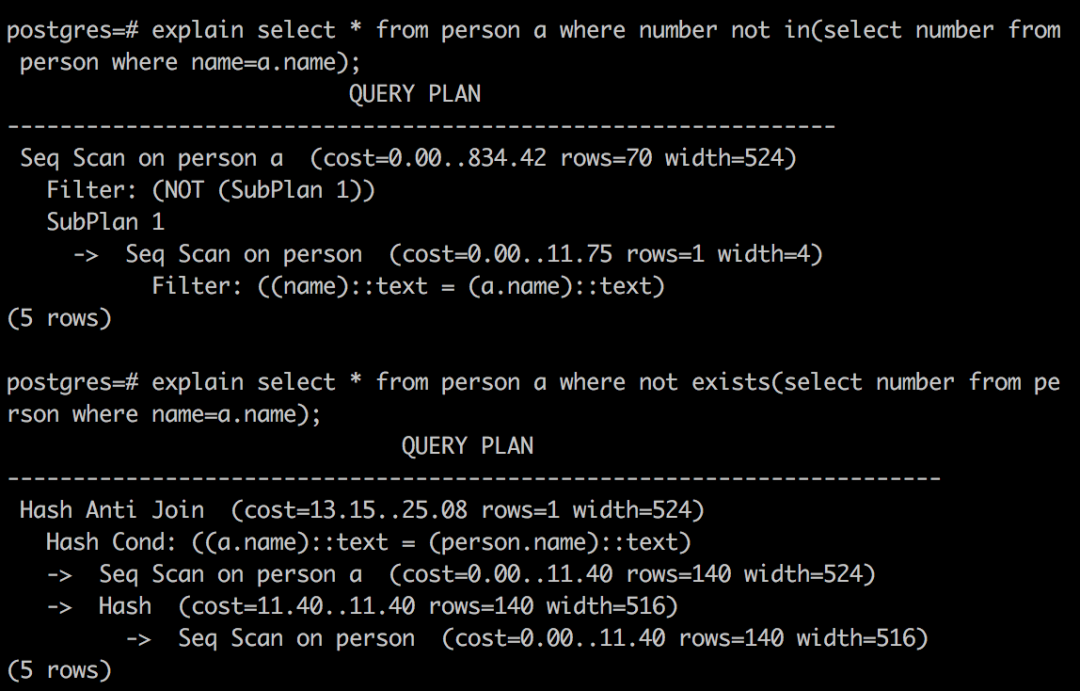 那么这种情况下,可以选择不将 NOT IN 子查询转为连接,例如 PG 在处理 NOT IN 子查询保留了原来的处理方式。