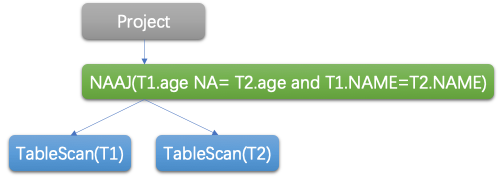 但还有一种选择,Oracle 在 《Enhanced Subquery Optimizations inOracle》一文中提到,他们采用了一种新的算子,Null-Aware Anti Join(NAAJ) 来处理。还是以 SQL1 为例,NAAJ 的处理算法如下: