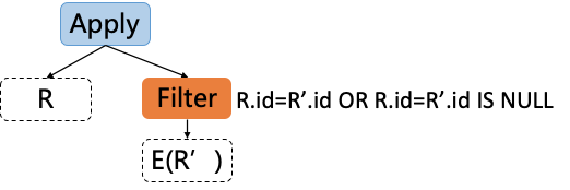 上一节提到,由于处理的是集合数据,子查询应该从表达式中剥离出来,以算子的方式展示在执行计划中。这个指代子查询的算子一般称之为 Apply。