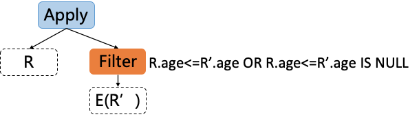 Semi:(EXISTS, IN, ANY) 可拆解为析取的逻辑关系,例如 AGE IN (SELECT AGE) 子查询可表达为 a.age=b.age[0] OR a.age=b.age[1] OR ... OR a.age=b.age[n]