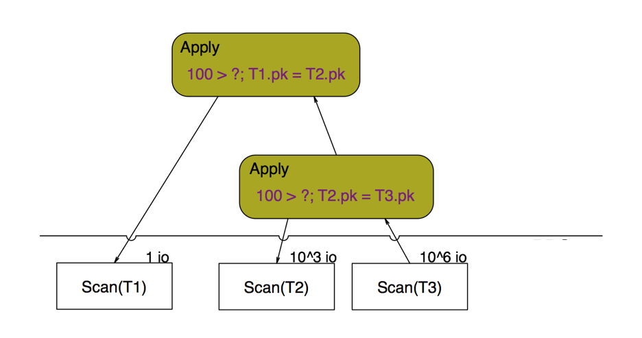 T1 表作为最外层的主表,只需要扫描一次。扫出的数据有 1000 行,所以 Apply 会往 T2 这边扫扫描 1000 次;同理,每次扫描 T2 都需要扫 1000 次 T3。最终 T2 的扫描次数是 1000 次,T3 的扫描次数是 10^6 次。