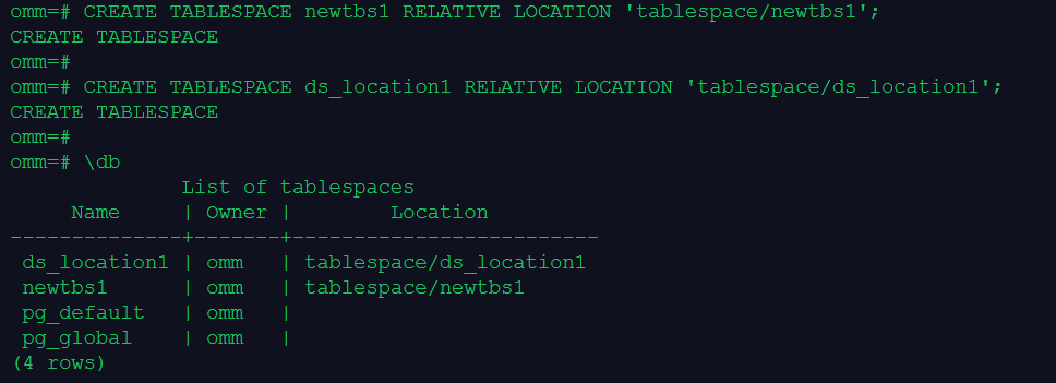 CREATE TABLESPACE ds_location1 RELATIVE LOCATION 'tablespace/ds_location1';