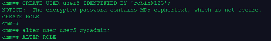 CREATE USER user5 IDENTIFIED BY 'robin@123';