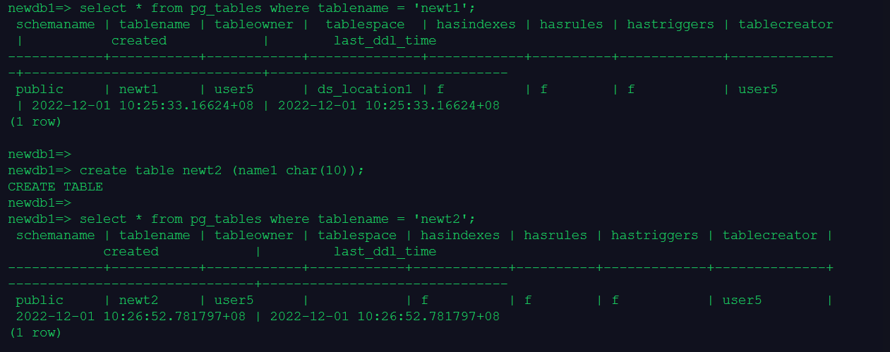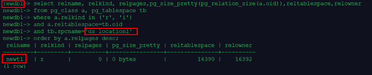 5.查看表空间 newtbs1、 ds_location1 上的对象