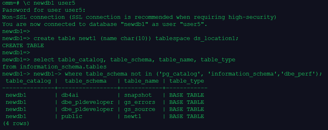 --user5访问数据库newdb1,在表空间 ds_location1上,创建一个表newt1
