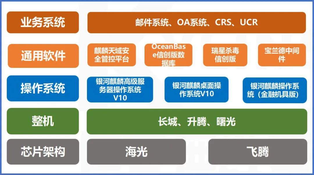 此次申报的城市商业银行办公一体化项目是天津银行自主创新实践的标杆案例,项目全部基于银河麒麟操作系统V10为安全底座部署银行相关业务系统,业务系统采用的服务器、终端和金融机具均采用海光、飞腾、等国产CPU,涉及72台长城一体机和升腾台式机的国产终端及域控客户端、19台国产服务器、70点金融机具等基础硬件,并由麒麟天御安全管控平台保障终端的管理及运维便捷性,国产OceanBase信创版数据库、宝兰德中间件服务客户业务系统,瑞星杀毒软件信创版用于保护数据安全,最终实现业务系统在全栈国产化平台上稳定运行。