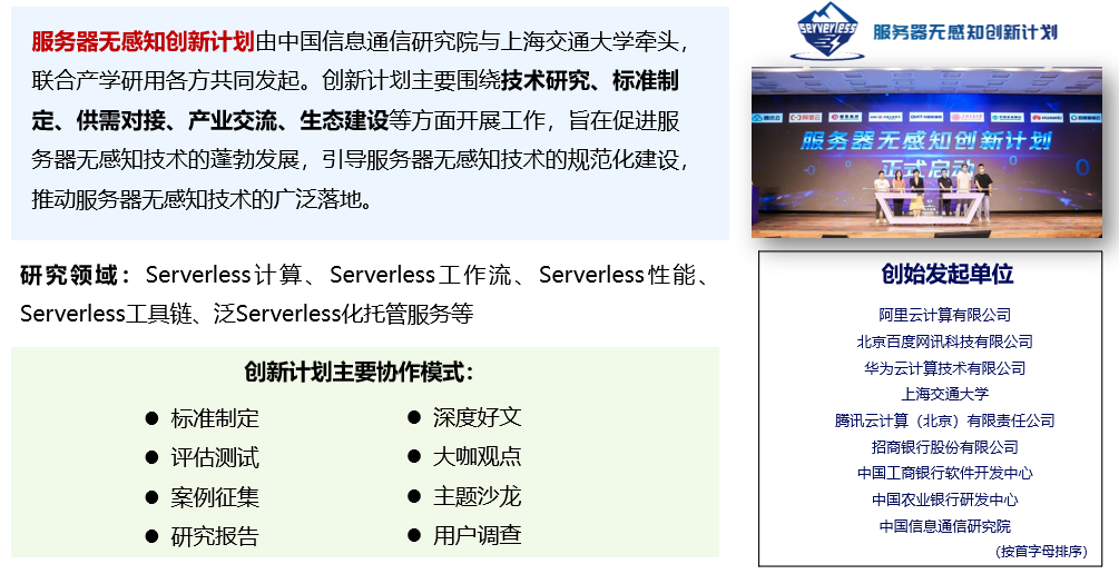 今年7月,中国信息通信研究院与上海交通大学牵头,联合产学研用各方共同发起成立“服务器无感知创新计划”(以下简称“创新计划”)。