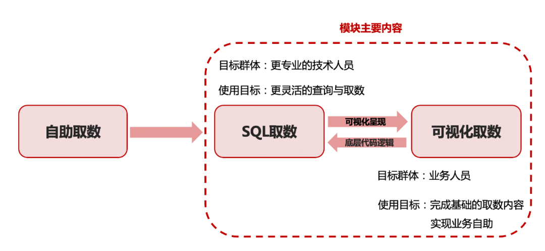可视化取数的用户目标群体为业务人员,帮助他们快速完成相对简易的取数内容实现业务自助;SQL取数的目标群体为更专业的技术人员,以便他们更灵活的查询与取数。