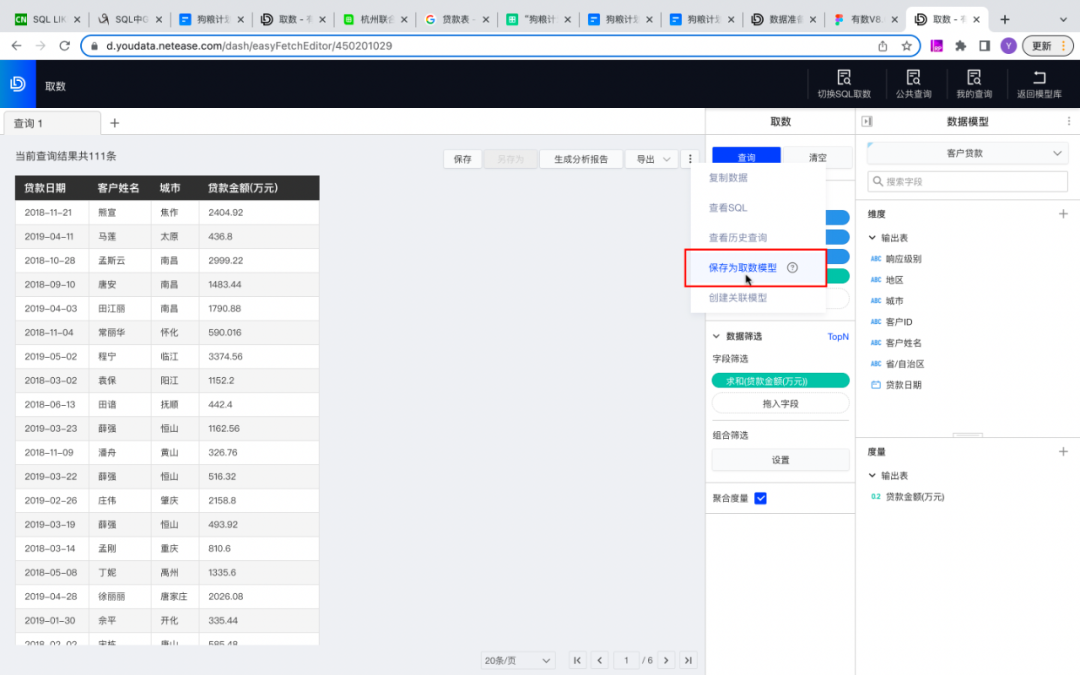在用于当前取数的数据模型内选择客户贷款模型,拖入与贷款用户相关的字段(贷款日期、客户姓名、城市、贷款金额)放入列中,通过数据筛选贷款金额字段获取贷款数大于300万元的客户,点击查询后,将这份查询结果保存为取数模型。