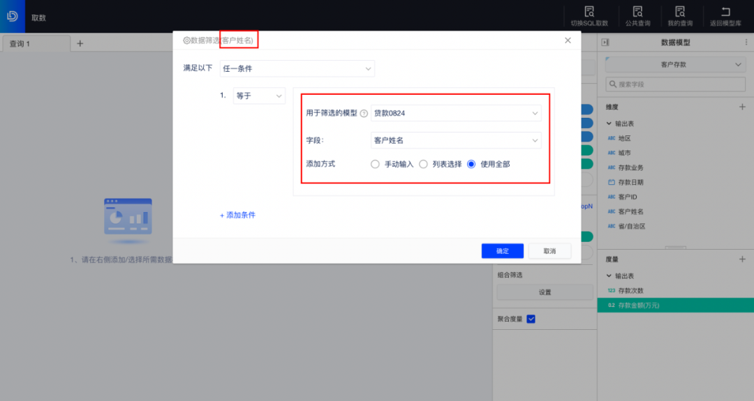 将客户姓名字段放入数据筛选中,选择用户筛选的模型-先前保存的“贷款0824”取数模型,选择客户姓名为跨模型筛选匹配字段,选择使用全部内容,配置完成后就将这份客户名单作为条件来筛选当前存款客户名单。