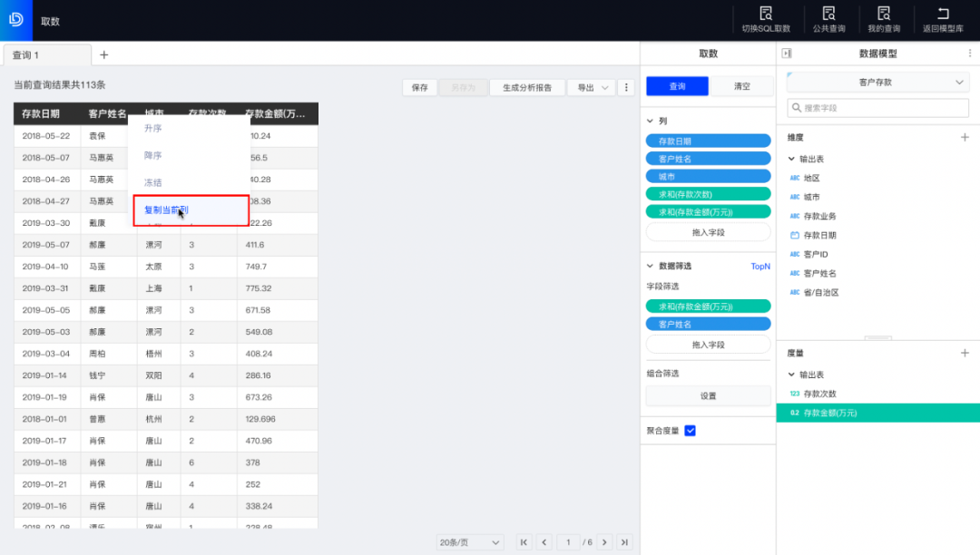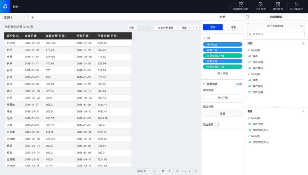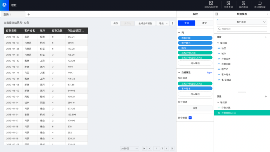 与第一步相同的方式,在用于当前取数的数据模型内选择客户存款模型,拖入与贷款用户相关的字段(存款日期、客户姓名、城市、存款次数、存款金额)放入列中,通过数据筛选存款金额字段获取贷款数小于800万元的客户,点击查询后,得到对应查询结果。