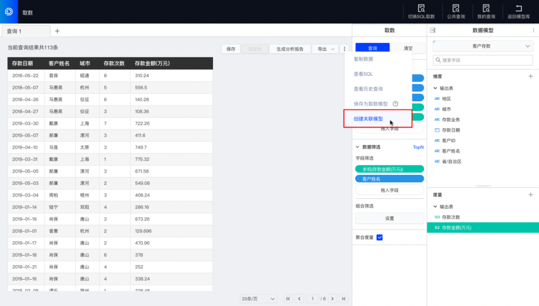如果我们还想保留一份此客名单户对应的贷款数与存款数放在同一张表内以便后续业务工作,在刚才的查询结果页面,点击更多图标,选择“创建关联模型”。