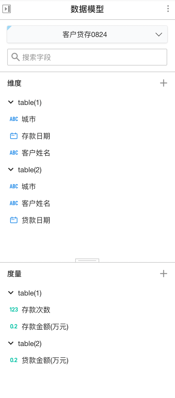 在数据模型下选中取数模型 - 客户贷存0824,可以看到模型信息已经是关联后的表与字段了: