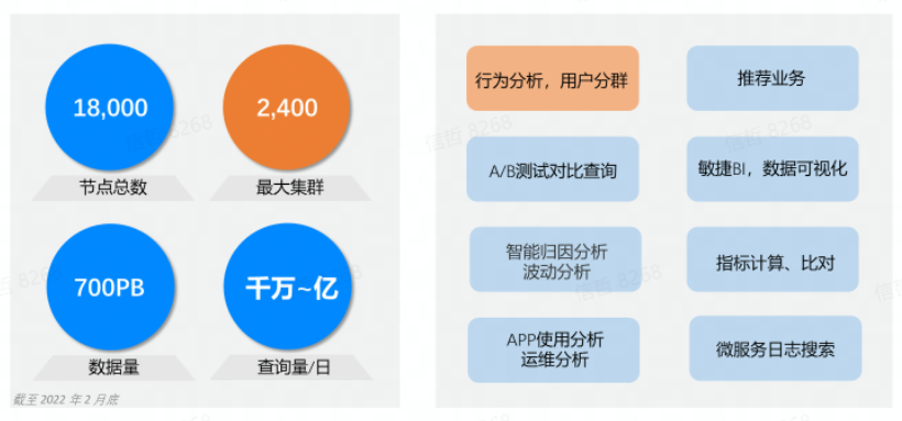 以抖音集团内部建于 2017 年的行为分析平台为例,仅头条和抖音两款应用每天会产生万亿条级别的事件记录,且至少保存 1 年,分析的特征维度能达到上千,既有聚合查询也有明细查询,其自助式查询分析要求必须达到秒级响应。当前这个平台运行在 2400 个节点的 ByteHouse 集群上。